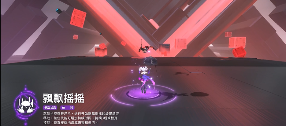 飘飘摇摇:魔女跃至半空撑开洋伞,随即进入飘飘摇摇的缓慢漂浮状态,按住技能键可延长持续时间,若持续3秒后松开技能,便会直接落地并造成伤害与击飞效果。