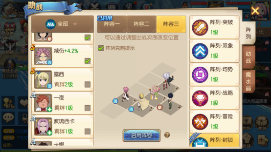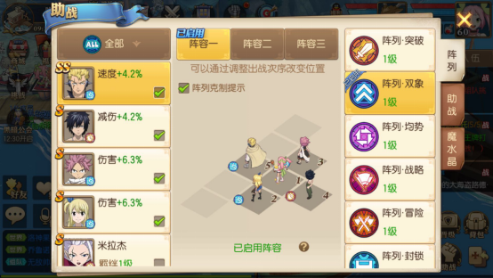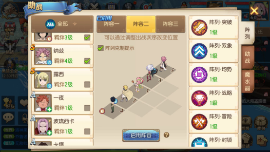进入《妖精的尾巴:魔导少年》游戏后,点击界面右下角的“助阵”按钮,即可看到三个预设阵容,分别是阵容一、阵容二和阵容三。其中,当前正在使用的阵容上方会标注“已启用”的字样。