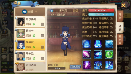 朱毕安的定位是输出型角色,建议安排在后排位置作战。她初始自带的技能为水流展破,最突出的能力是魔法攻击。随着羁绊等级的提升,她各项技能的属性数值也会相应增强。不过需要注意的是,她的物理暴抗、魔法暴抗、格挡以及抵挡几率均为0。