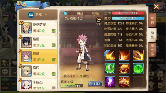 纳兹的定位是主力,推荐站在前排位置,初始自带技能“火龙的咆哮”。他最突出的优势在于魔法攻击能力,生命值、魔法攻击、魔力值、物理防御和速度这些属性,都会随着羁绊等级的提升而相应增加。不过需要注意的是,他的物理暴抗、魔法暴抗、格挡以及抵挡几率均为0。