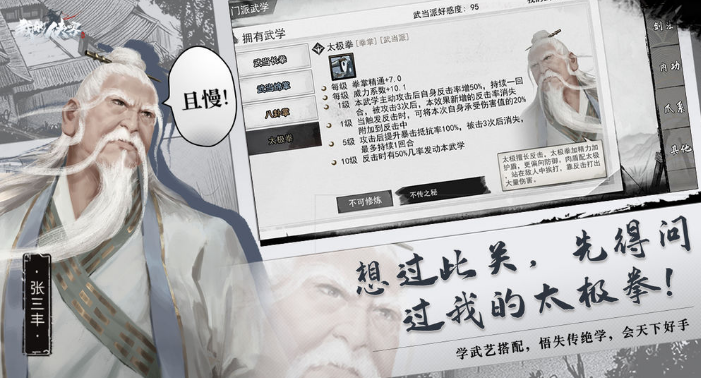 11、张三丰明着赶杨雪峰离开师门,暗地里却送他一本太极剑谱,席默默入队。