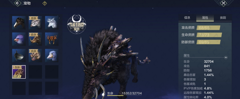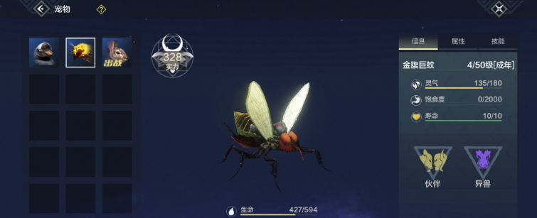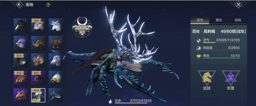 瞧瞧这只蝎子是不是有点奇特?它生着一双雕的翅膀、一对鹿角、蠃鱼的嘴巴(神兽尾巴记不清了,反正肯定不是原本的蝎子尾巴啦)。这便是传说中的吞噬系统,捕捉宝宝时会有概率得到宠物蛋(孵化后获得永久宝宝)和临时宝宝(留存5分钟)。临时宝宝可以被比它强的永久宝宝吞噬,吞噬之后,有一定概率获取可替换的部位部件。要是吞噬到翅膀这种多功能部件,原本不会飞的蝎子,就能在空中翱翔了。不管吞噬过程有没有得到部件,都能获得经验。