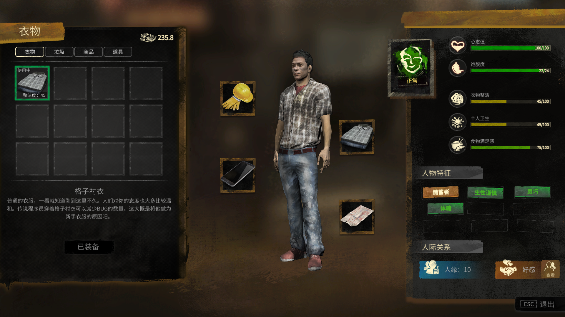 在游戏界面里,剩余天数的右侧是角色菜单栏,我们可以通过按下快捷键P,或是点击游戏右上角的“角色”按钮,来打开角色面板与背包。