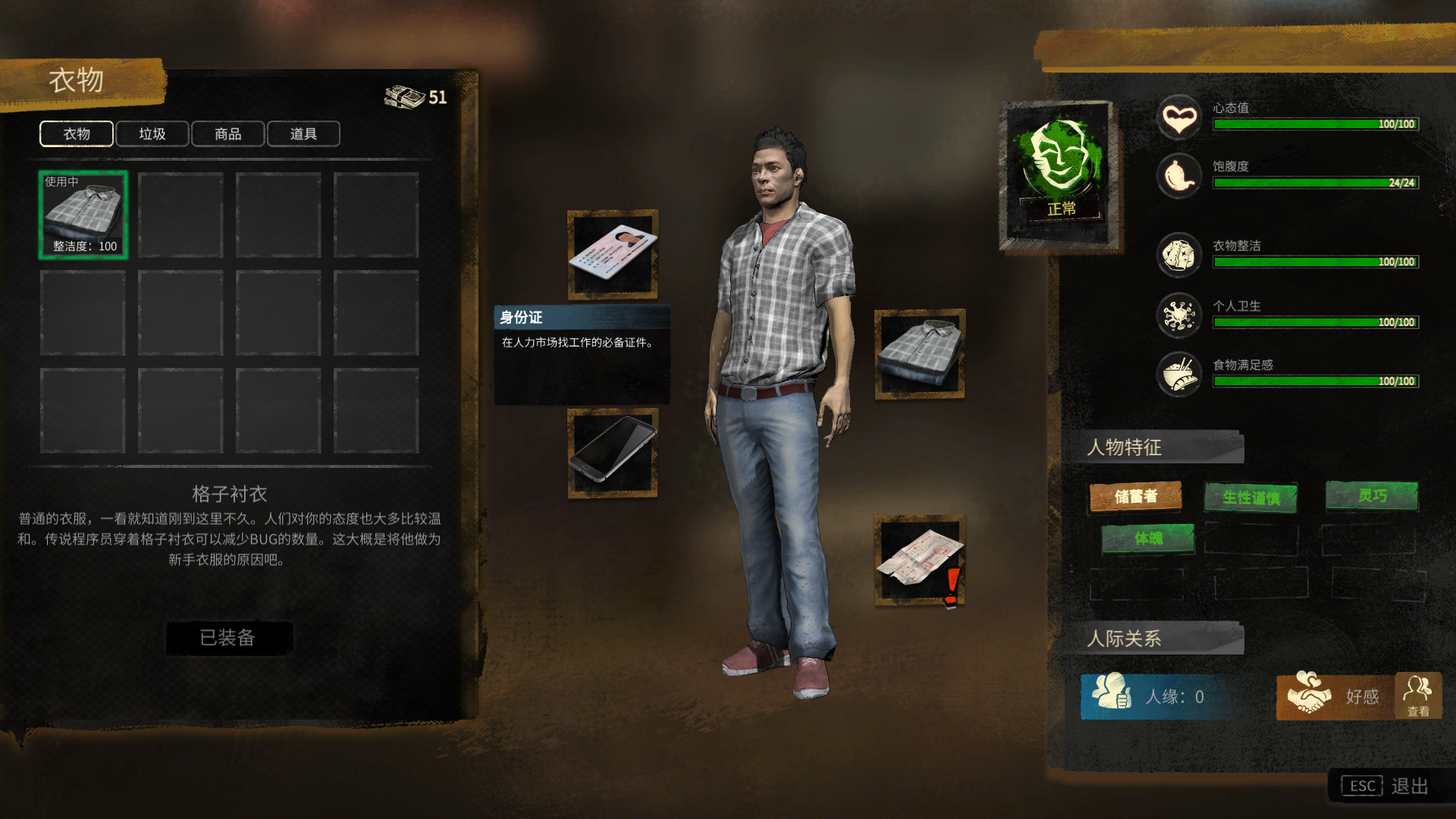 在初始默认状态下,角色身上已装备身份证,清晰可见。