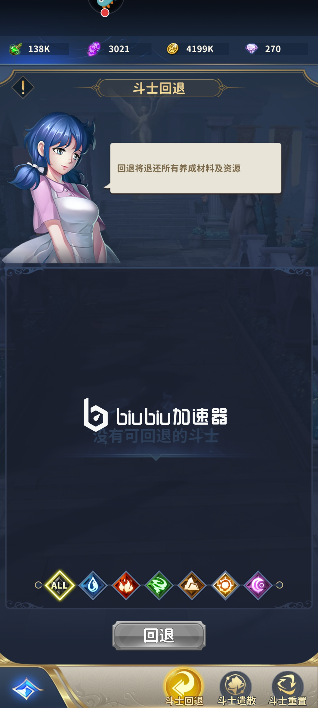 玩家同样可以对无用的斗士执行回退操作。和遣散机制不同,斗士回退只会返还玩家为该斗士投入的所有养成材料与资源;回退结束后,该斗士的等级将重置为1级,能够当作高等级斗士升星所需的养料卡,助力其他主力斗士提升战斗力。