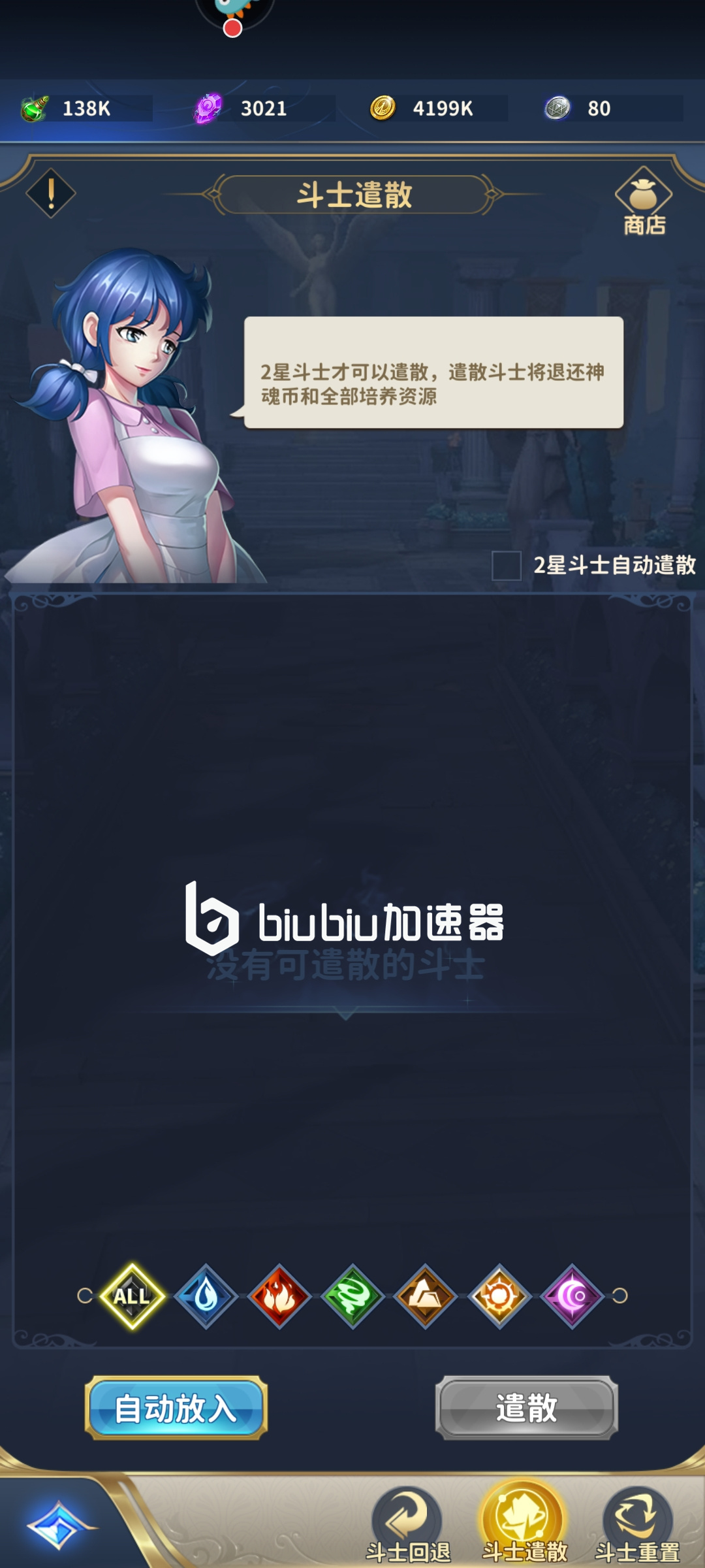 在游戏里,玩家还能借助斗士遣散功能,把暂时派不上用场的二星斗士进行遣散处理。遣散之后,玩家会收到系统返还的神魂币,以及此前投入的全部培养资源,同时斗士栏被占据的格数也会相应减少。而这些通过遣散获得的神魂币,还能用来购买其他高等级、高星级的斗士碎片,从而助力提升现有斗士的战斗力。