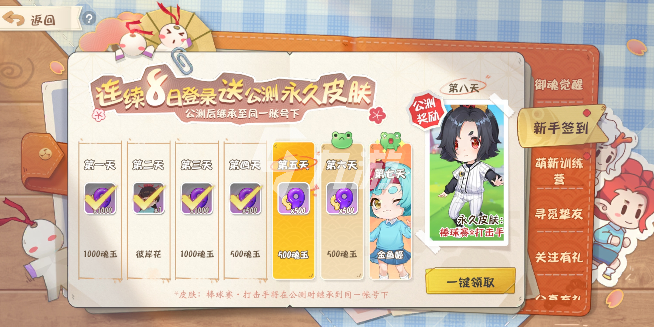 玩家参与新手八日签到活动,累计登录第二天可领取式神彼岸花,第七天能获取限定式神金鱼姬,第八天还可获得限定皮肤鬼使黑-棒球打击手,此皮肤在公测后会继承至和内测相同的账号中。