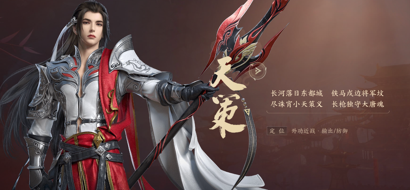 首先要给大家推荐的第一个职业是游戏里近战攻击能力出色的【天策】,这个门派属于外功属性职业,近战攻击与防御表现都很优秀,在副本中能作为副输出使用。从立绘形象来看,天策是擅长用长枪作战的门派,在游戏里通过长枪对敌人进行持续输出,攻击时还能让敌人陷入僵直状态。