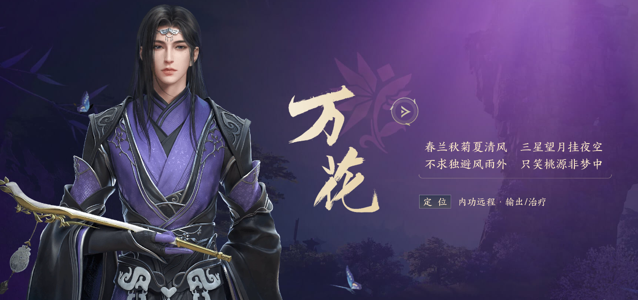 第二个职业推荐大家选择游戏里人气超高的辅助职业【万花】,它属于治疗与输出双修的类型,尤其擅长以内功远程攻击的方式对敌人造成伤害!玩万花的时候,一定要先搞清楚这个门派攻击和治疗的两种不同模式:攻击时可以切换成【花间游】流派,这个流派主打输出伤害,治疗技能会相应转换,但自身血量比较脆,团战中容易被不明AOE波及,所以后续点天赋时记得选一些保命技能!