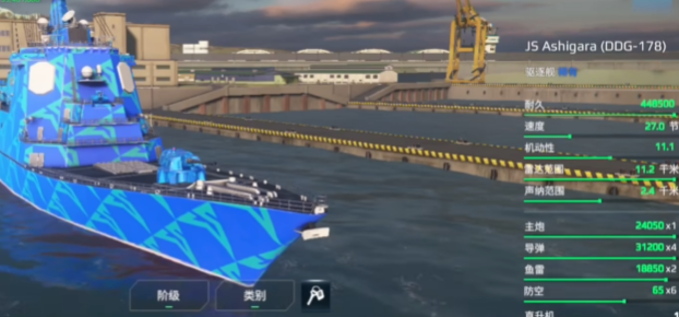 足柄号的主武器是四连装导弹,不仅火力集中,射程也相当可观,能在远距离对敌方大型舰艇发动攻击。但在对战时,要留意敌方舰艇的防空火力分布情况,尽量选择防空相对薄弱的角度进行发射,以此提升命中率。副武器配置上,它配备了6枚防空导弹,并搭配常规近防系统,主要用来应对敌方的空袭。当敌方战机或导弹来袭时,近防系统会自动启动,而防空导弹则可由玩家手动操控,优先拦截对自身威胁最大的目标。不过需要注意的是,在20级之前,其导弹比较容易被敌方拦截,所以战斗中要把控好导弹的发射时机与频率,避免过多导弹被拦截而浪费输出机会。
