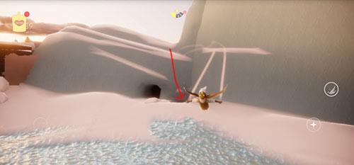 1、第一步是前往霞谷,然后一同来到冰湖广场,之后往右边望去,能看到一个洞穴,就像图中展示的那样。
