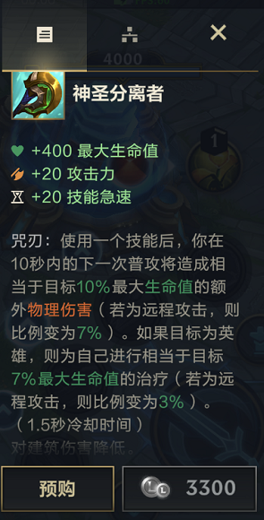 这件被玩家俗称为“神分”的装备,在对抗坦克英雄时能打出相当可观的额外伤害——目标的最大生命值越高,它提供的额外伤害就越显著,具体数值按10%计算;并且在造成伤害后,还能根据对方当前血量的7%来回复自身生命值。从基础属性层面分析,这件装备更偏向战士类英雄选择,像青钢影、猴子这类英雄就比较适配它。