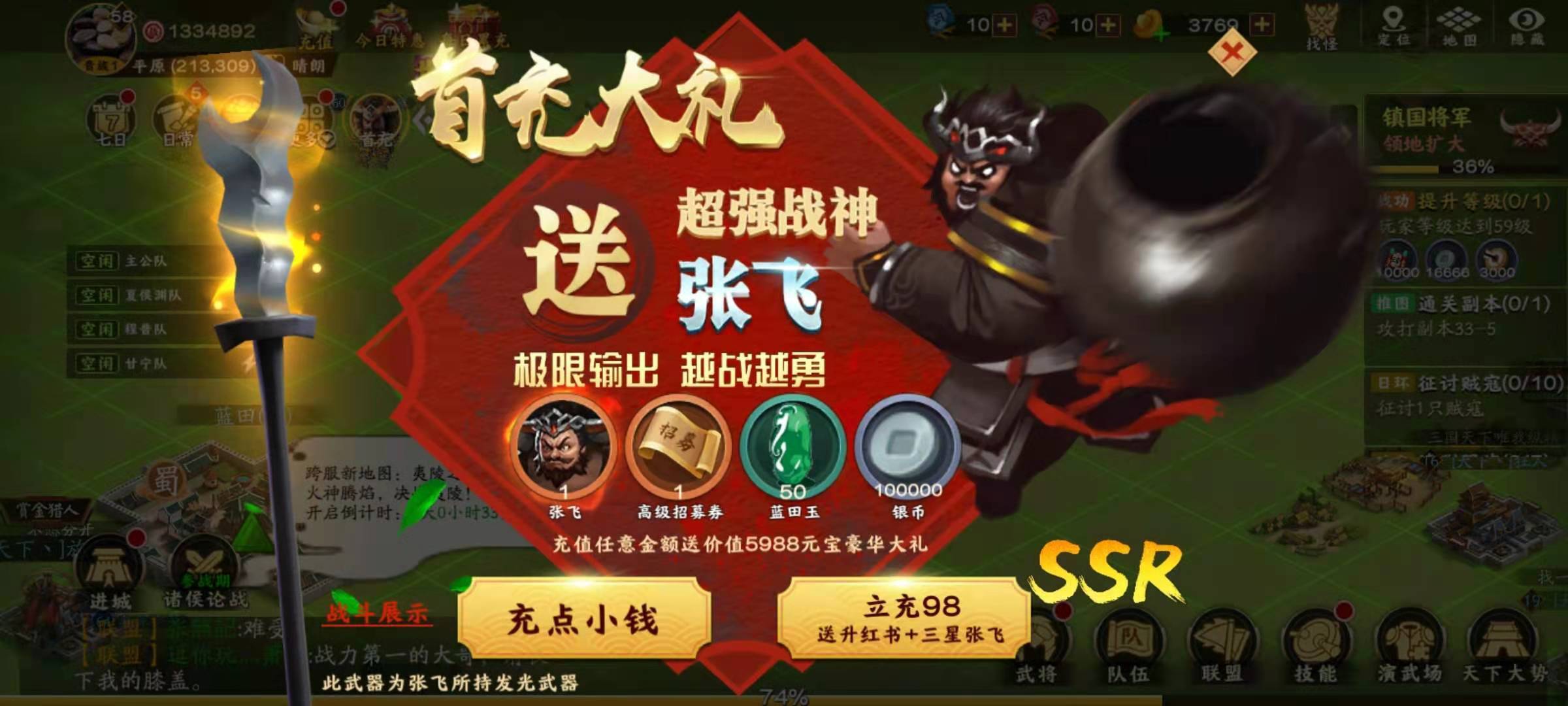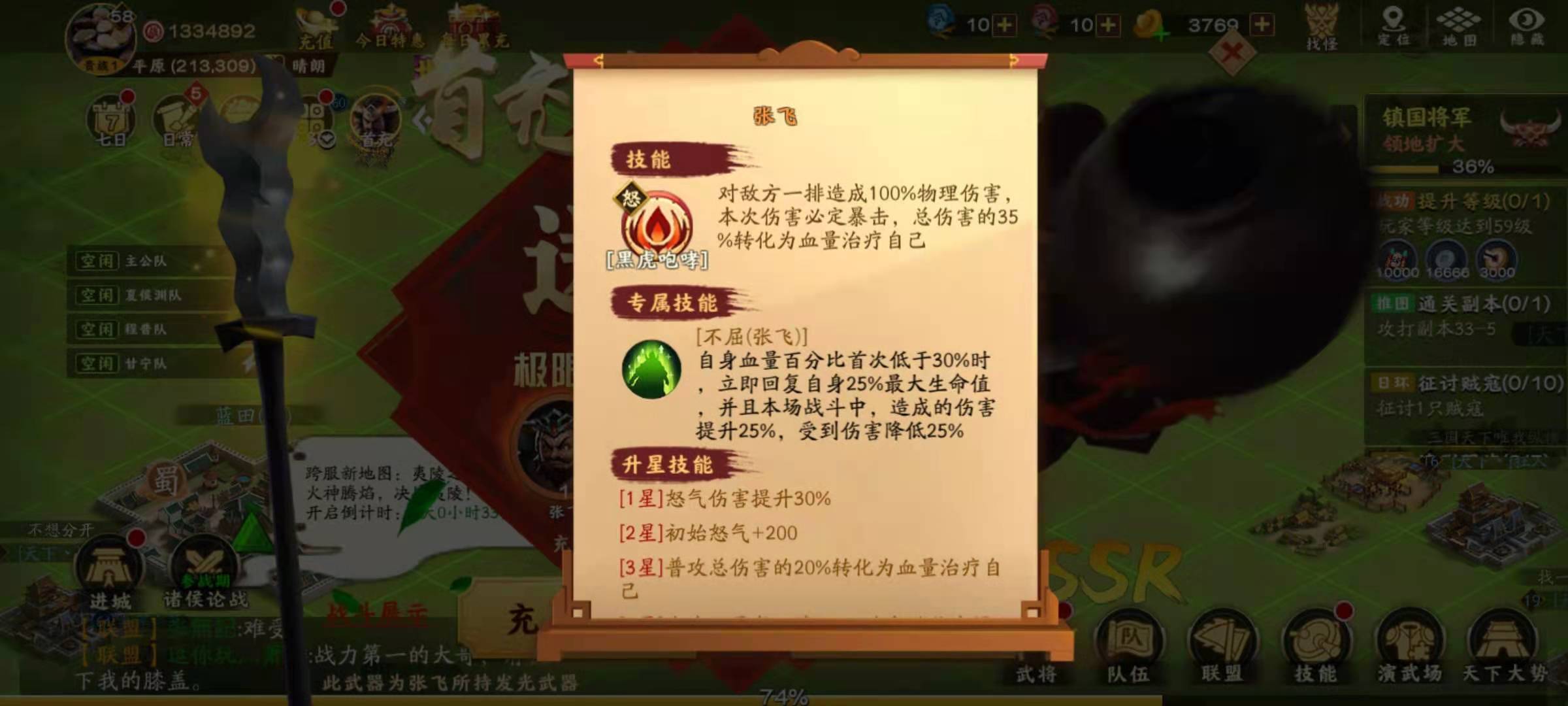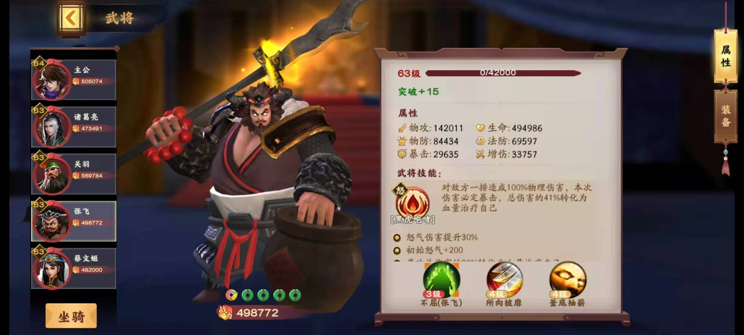 张飞虽然位列橙色武将序列,但他的获取方式和普通橙色武将不一样——张飞是首充赠送的武将。大家都清楚首充通常都很超值,所以作为首充福利的张飞,实力自然不会弱。他自带的技能叫黑虎咆哮,不仅能对敌方一整排武将造成伤害,而且技能伤害必定暴击,暴击伤害至少是基础伤害的一倍以上;此外,技能造成伤害后,还能按照伤害总量的一定百分比转化为自身血量,相当于自带吸血效果。