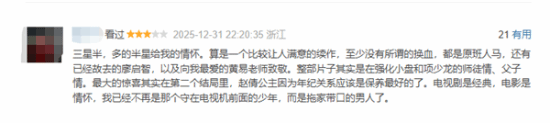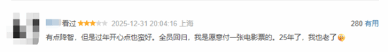 有网友说:“尽管剧情挺让人觉得没什么逻辑、还很无厘头又好笑,但我依旧愿意因为情怀去支持。”“剧情是有点让人觉得不太动脑筋,不过过年嘛,图个开心也挺好的。看到大家都回来了,我是愿意买张电影票去看的。这都过去25年了,我也已经不再年轻了。”