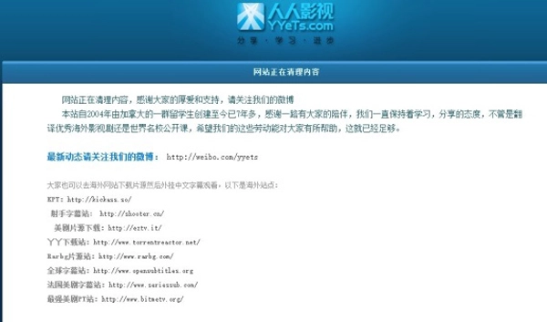 现在,人人影视首页的公告内容有了变化,从“正在清理内容”更新为“网站已关闭正在清理内容”。这表明人人影视已正式关站,这个陪伴我们约10年的美剧网站就此与我们告别。