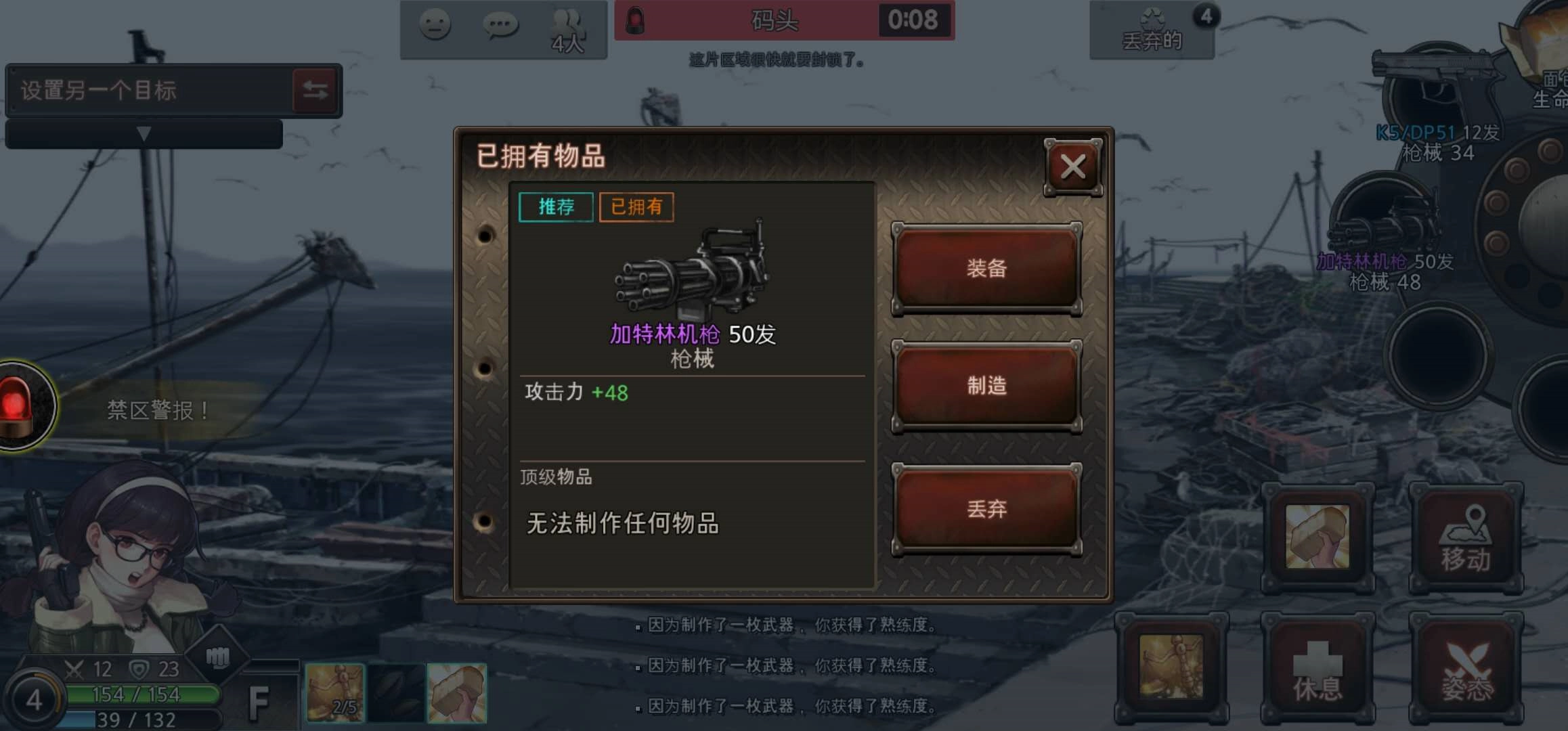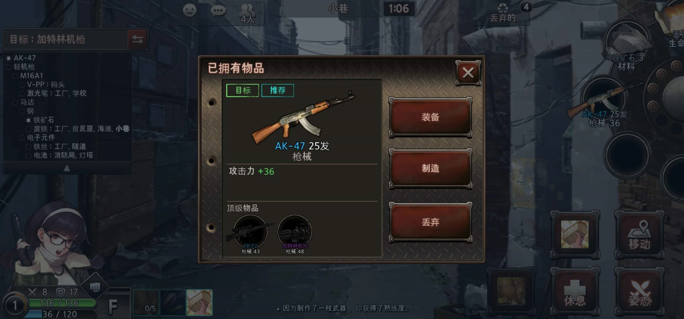 接下来我们可以前往码头找到那把绿色的枪械V-PP,接着去工厂和学校搜寻激光笔。等拿到这两样东西后,我们启动锻造模式,就能把它们打造成m16a1。之后我们还能再次开启锻造模式,将马达和m16a1合成为轻机枪。当拥有轻机枪和ak47后,我们就可以进行最后的锻造,把它们制作成我们的紫色材质武器加特林机枪。