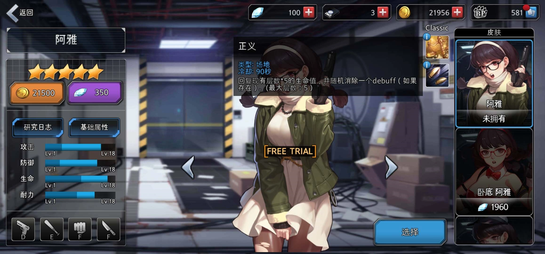 接下来我们看看阿雅的技能机制。她的首个主动技能名为“正义”,效果是根据当前累计的层数(上限5层),每层回复5点生命值,同时随机清除一个减益状态,技能冷却时间为90秒。从描述不难看出,这个技能的作用类似于《英雄联盟》中船长的“吃橘子”——既能解除负面效果,又能提供少量生命回复,实用性相当不错。 再看第二个主动技能“二连射”:使用后先触发一次普通攻击,消耗2发子弹;若此次攻击命中目标,则会追加一次攻击,追加攻击的伤害为武器攻击力的50%。简单来说,释放这个技能可以对目标造成两次伤害,但需要消耗2发子弹,且第二发的伤害只有基础攻击力的一半。不过,这个技能能让攻击频率提升一倍——相同时间内可以多打出一次伤害,所以整体效果也很出色。