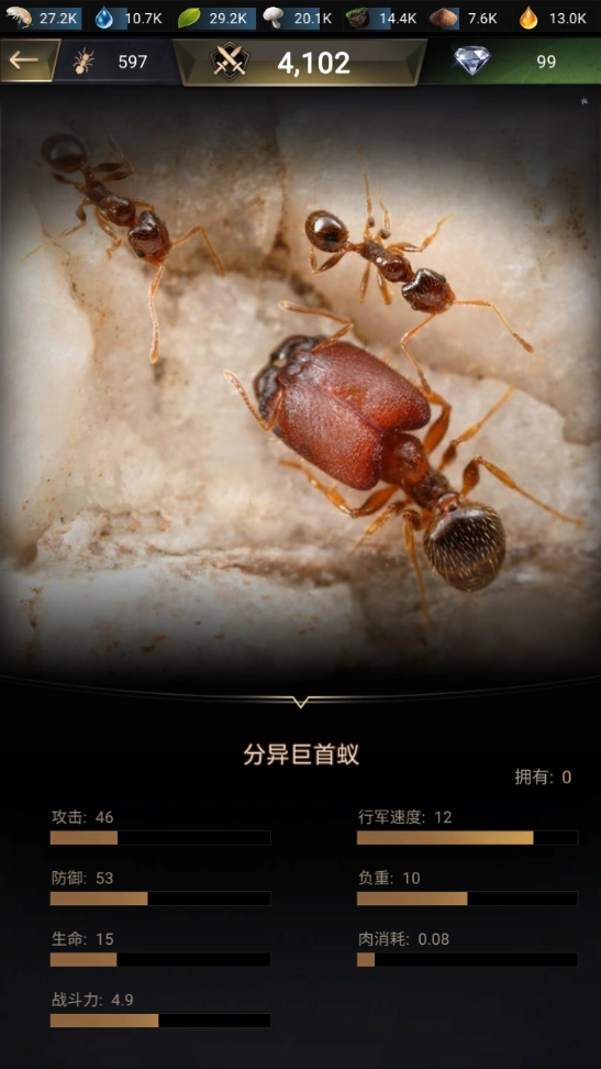 这是所有近卫蚁里综合战力最强的角色,唯独在速度和负重方面比另外几种强势蚂蚁略差一些,像攻击、防御、生命值这类属性,全都远超其他蚂蚁,当然,它对肉类的消耗也会更大。