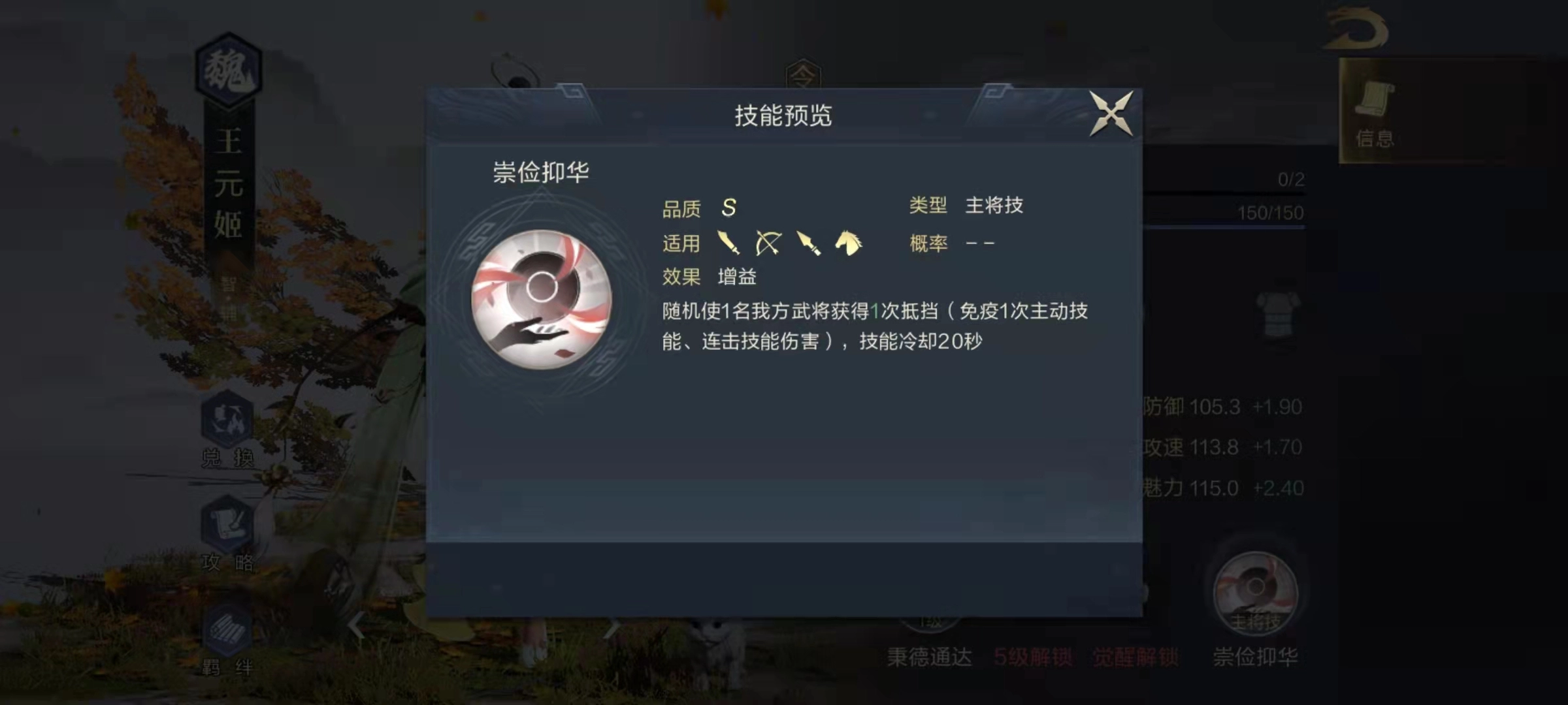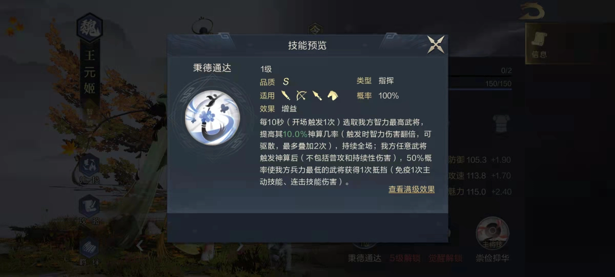 王元姬的这个技能效果看似复杂,核心其实是神算与抵挡两大属性——神算用于提升输出伤害,抵挡则能降低自身受到的伤害。当技能升至满级后,其附加的神算触发几率相当可观:每层效果可提升20%的神算几率,最多能叠加两层,总计达到40%。凭借这一特性,王元姬的辅助价值毋庸置疑,若搭配智力型高伤害武将,能让整体输出提升显著。