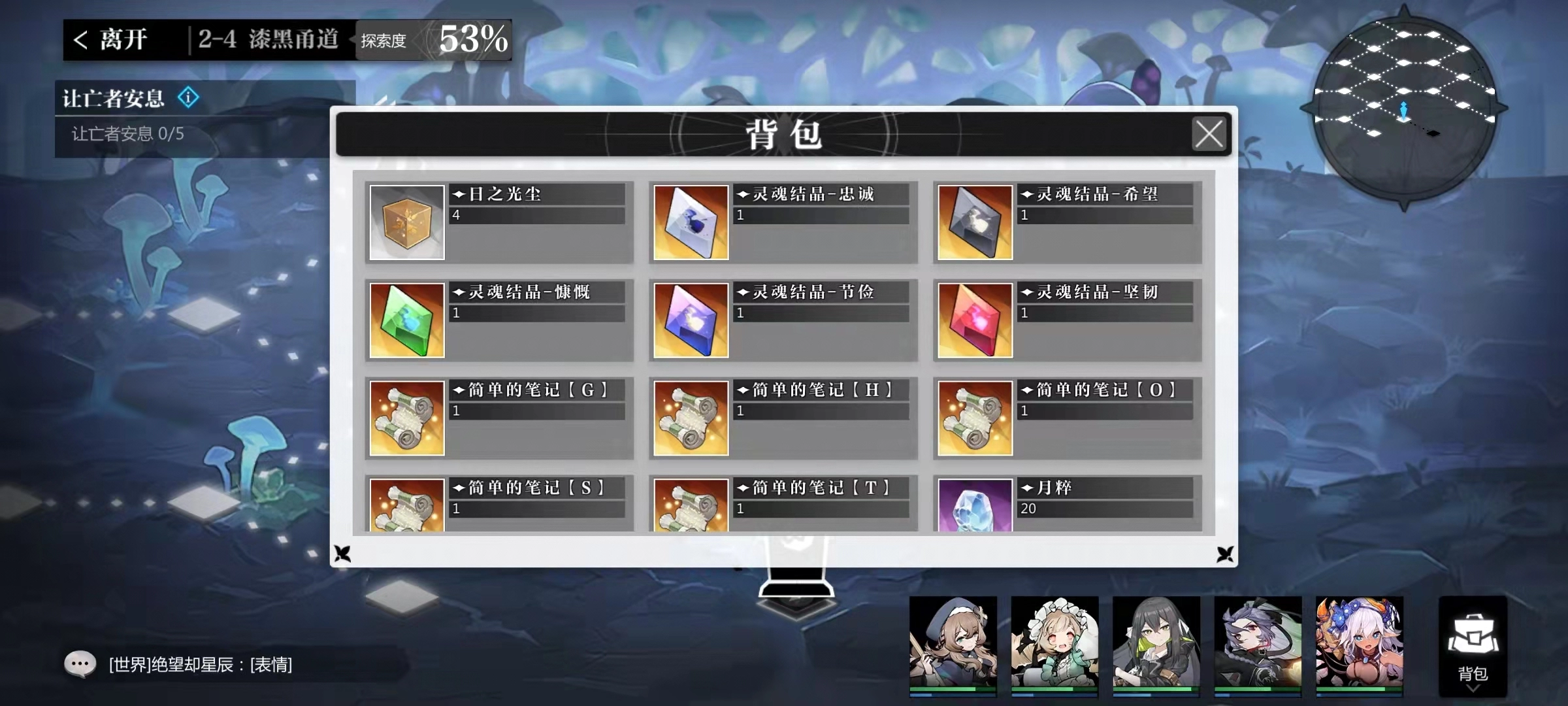 2-4关卡的核心挑战是让亡者安息,要达成100%探索度需提交6个灵魂碎片。若提交错误的灵魂碎片,全队会被扣除生命值,因此建议先彻底探索整张地图,击败五个小怪获取所有灵魂碎片——这些小怪难度不高,挂机即可轻松通过。收集完所有灵魂碎片后,前往关卡中央找到带有叹号的位置,获取五个灵魂墓碑对应的人物性格描述。最后依据这些性格描述,推断出每个灵魂碎片应匹配的正确墓碑并完成提交。