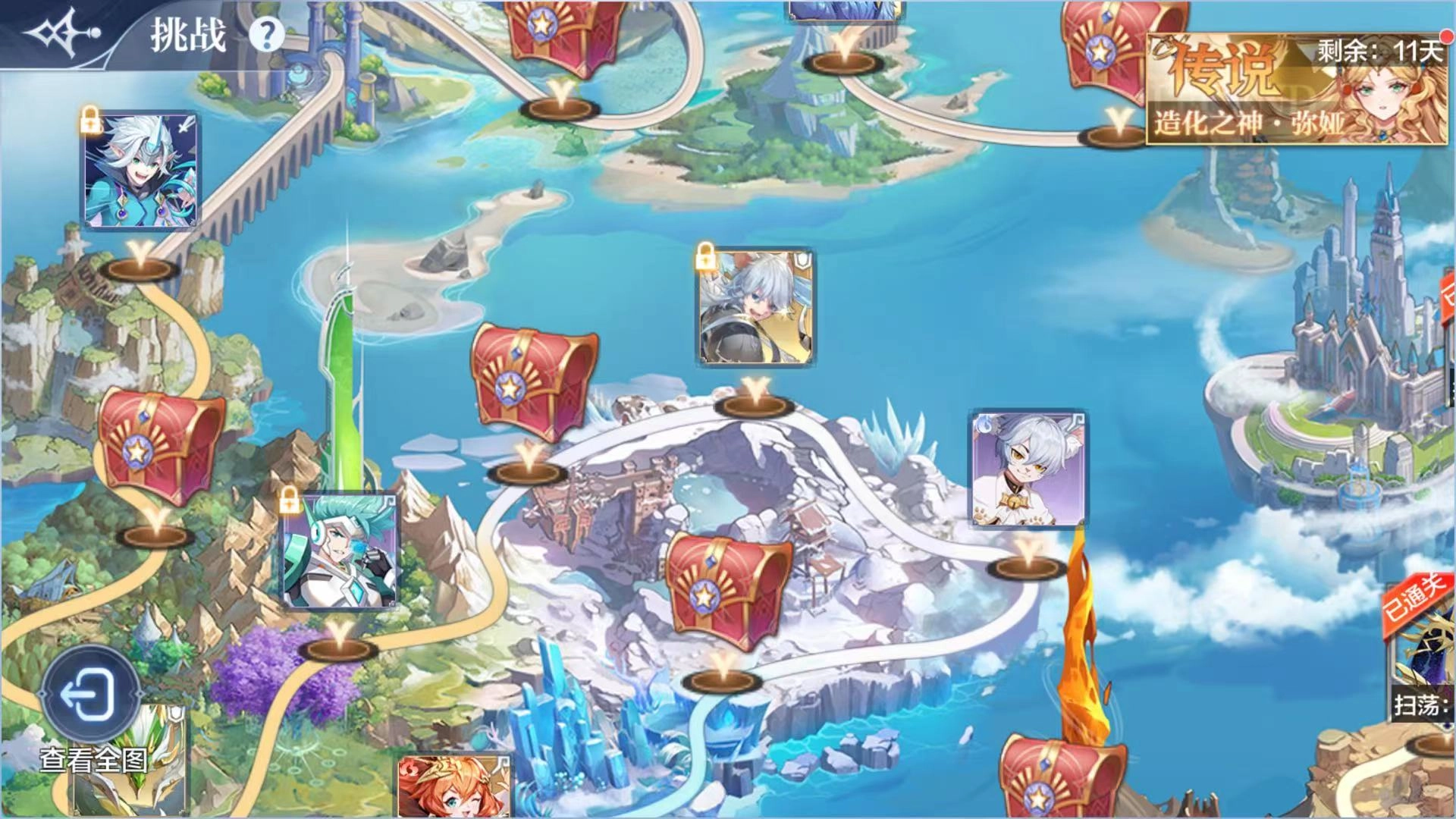 在精灵挑战玩法里能看到清晰的挑战路线,按照路线规则,得先战胜上一个精灵,成功后才能解锁下一个挑战目标;通关当前阶段后会得到对应的碎片道具,后续还能开启关卡扫荡功能,快速获取各类道具奖励。另外,每完成2个挑战关卡,就能领取一份宝箱奖励。