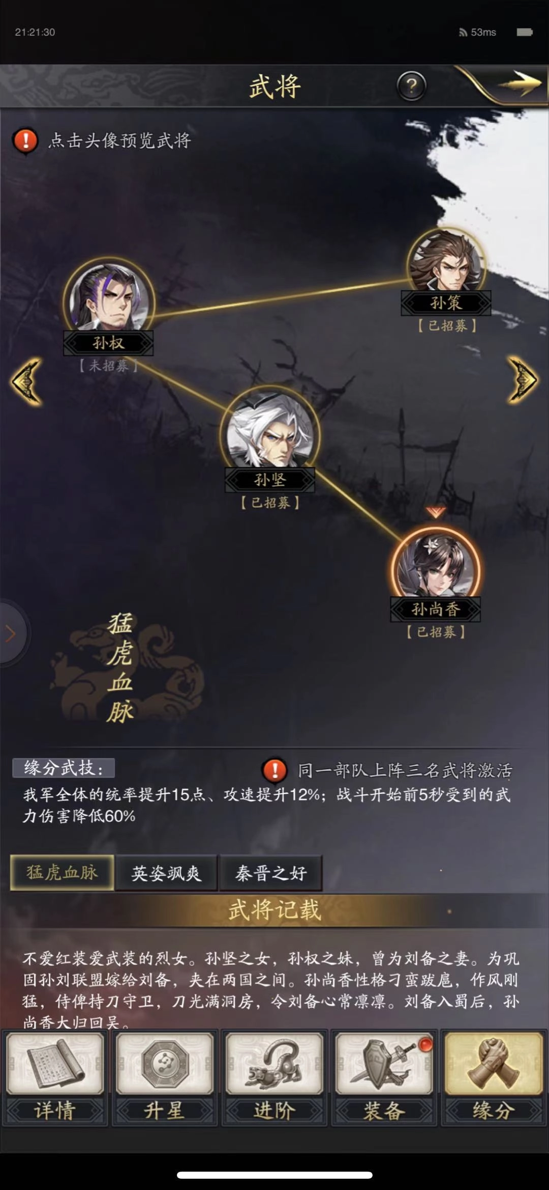 2. 等我们获得其他金色武将卡后,就可以着手思考阵容搭配的问题了。这套缘分效果涉及孙坚、孙权、孙策三位角色。