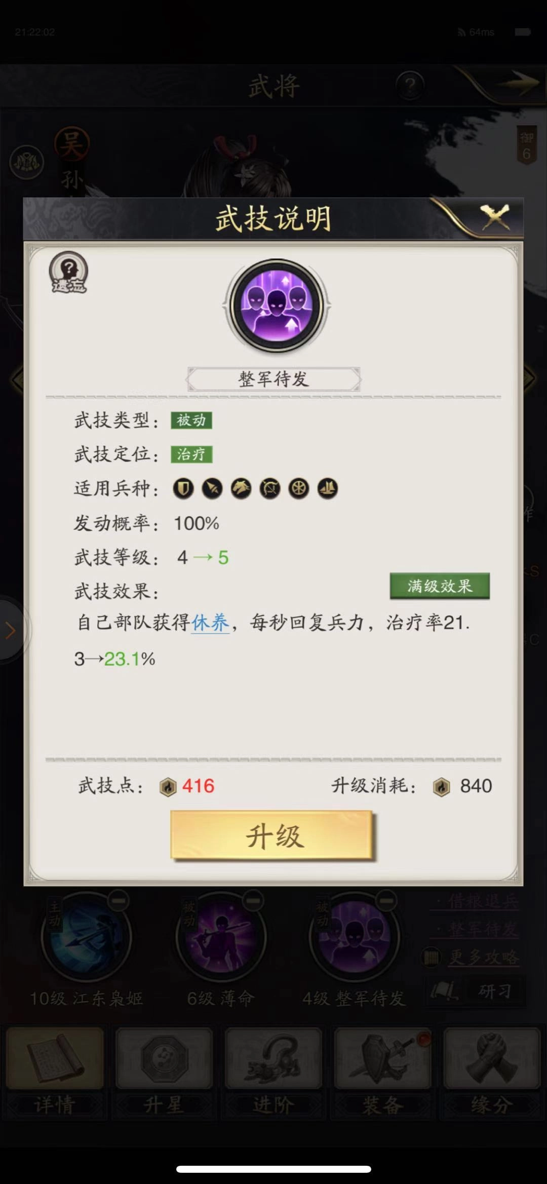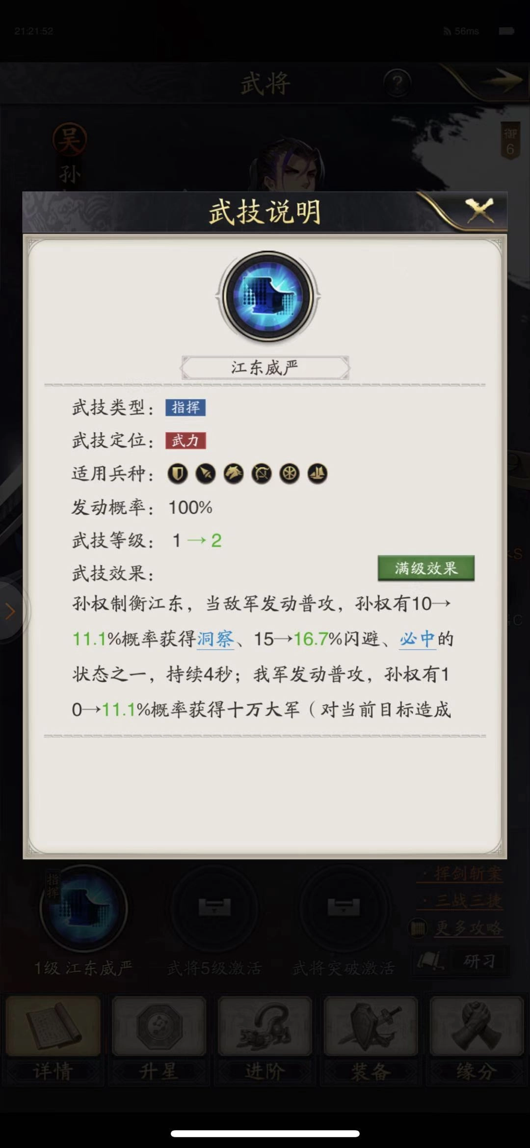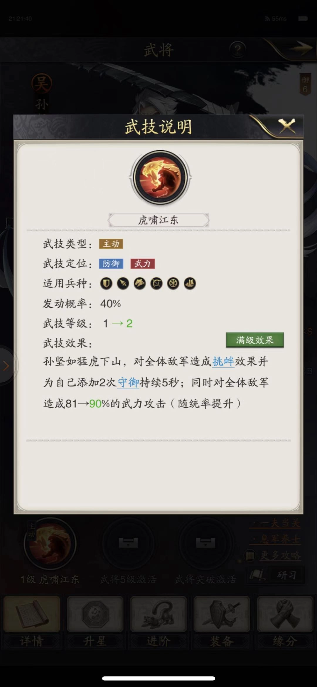 孙策发起攻击时,有50%的概率为目标叠加BUFF效果。首次叠加该BUFF能使后续对其造成的伤害提升至原来的两倍;若同一支部队再次被叠加此BUFF,则可造成超过4.5倍的伤害增幅。(骑兵适性S,水兵适性S)