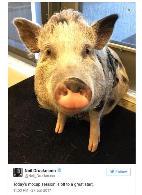 这次让一头可爱的猪参与动作捕捉,着实让工作室赚足了眼球,从侧面也能看出顽皮狗在游戏制作上的用心程度。这一消息是由游戏总监Neil Druckmann与《西部世界》的作者Halley Gross通过推特共同公布的。