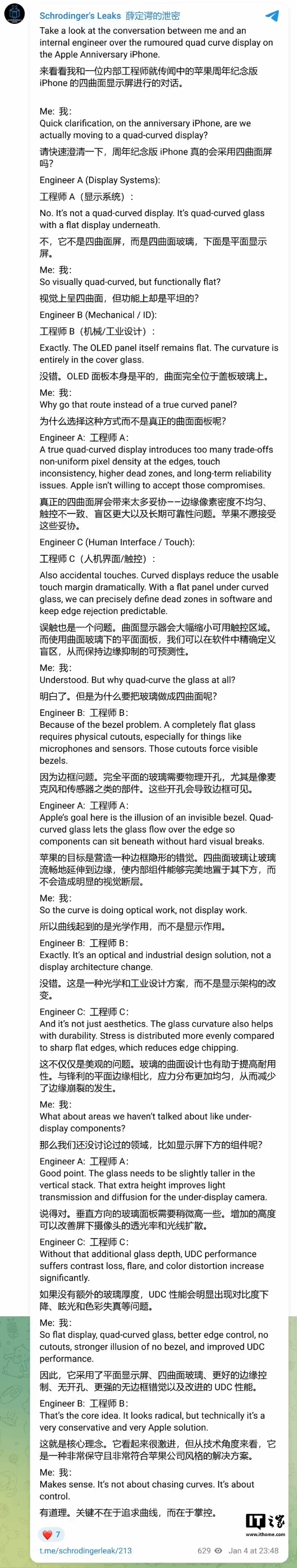 消息源@phonefuturist在1月4日通过X平台发布推文,分享了一份据称来自三位苹果工程师的Telegram对话记录,其中透露了有关2027年苹果“20周年纪念版iPhone”的相关信息。