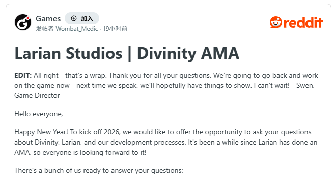 美国当地时间1月9日,拉瑞安工作室在reddit平台开展了一场小型的AMA新《神界》答疑活动,公司CEO斯温·芬奇(Swen Vincke)参与其中,针对玩家关心的问题进行了解答,并着重说明新作在游戏艺术创作环节未采用AI生成内容。