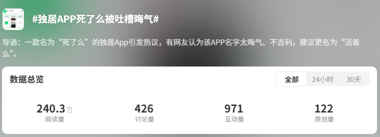 这次事件其实也折射出一个现实问题:如今独居人群对安全保障的需求日益迫切,可市面上对应的相关工具却寥寥无几。而此次「死了么」的意外走红,也让更多人开始关注到独居群体这一被忽视的存在。