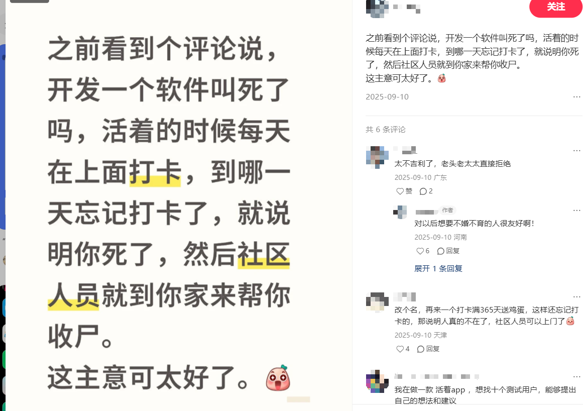 网友们表示,如今独居的人日益增多,“孤独死”成了不少人心中的隐忧。这款App的名字虽说直白,却精准地击中了社会痛点,反倒能提醒大家重视独居人群的安全问题。