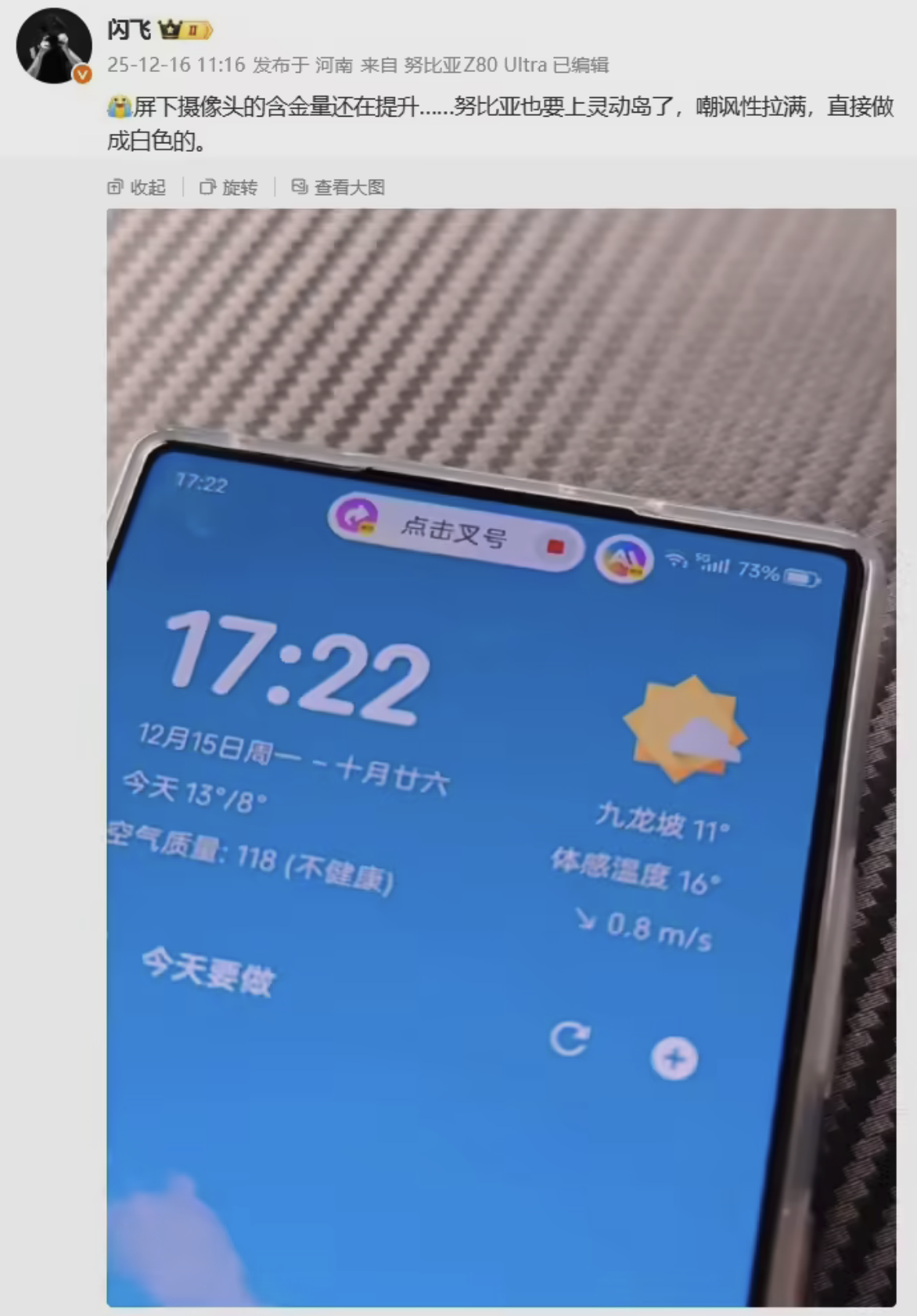 12月21日消息。近日,科技博主@闪飞在社交平台发布动态,透露努比亚即将在旗下机型中引入类似苹果“灵动岛”的交互功能,该功能采用白色设计,并且支持用户自主选择开启或关闭。这一消息迅速引发行业关注,成为全面屏时代交互创新领域的又一焦点。