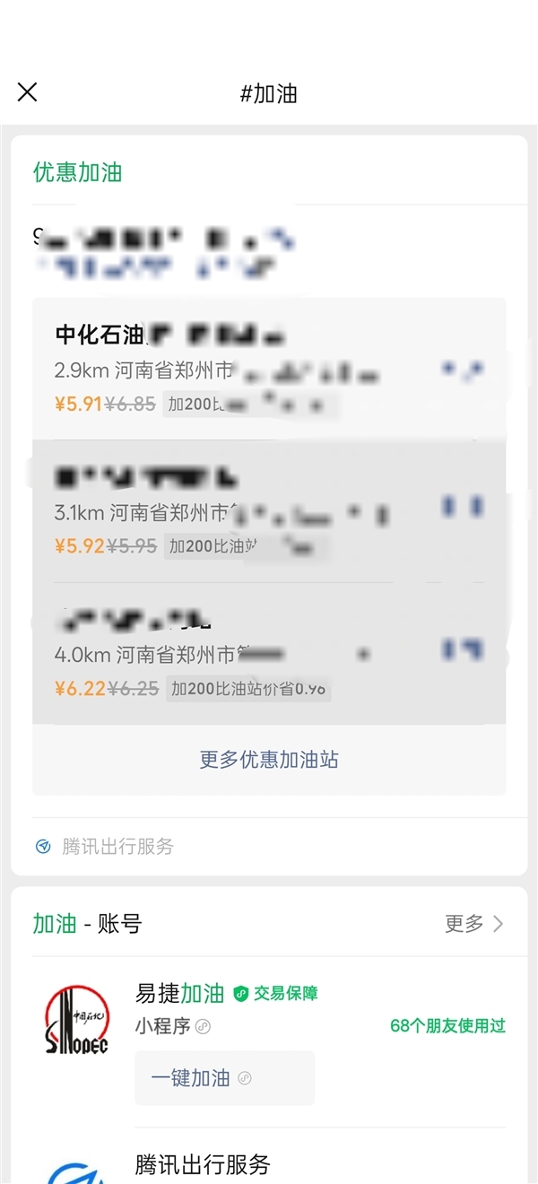 和查询火车票的操作类似,在微信里输入并发送“#加油”,之后点击就能看到附近的加油站以及油价信息。