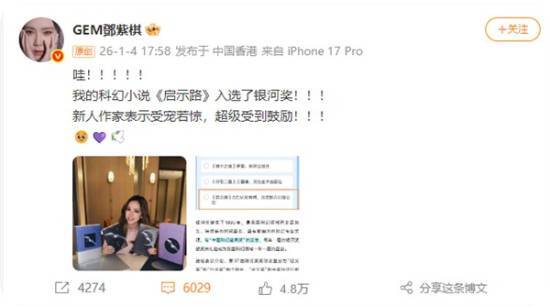 1月4日,邓紫棋发文回应自己创作的小说《启示路》入选银河文学奖一事,这位新人作家称自己受宠若惊,同时也感到备受鼓舞!!!