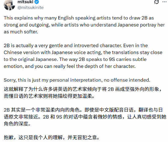 有观点指出,英文版2B的部分台词语气更显冷淡,使得英语地区的玩家对她形成了“高傲”“刻薄”之类的印象,相比之下,日文版的表现则更为内敛柔和。