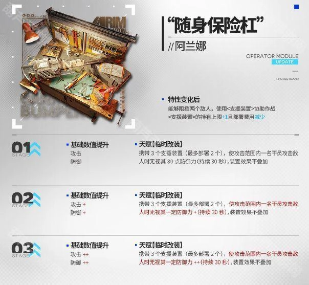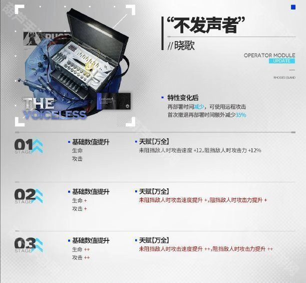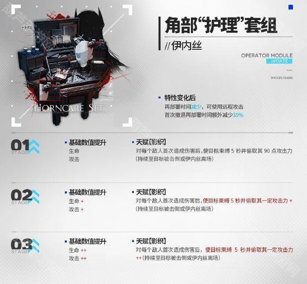 1这是伊内丝模组里最特别的一档——1级效果堪称巅峰,后续升级反而显得性价比极低。没潜能的情况下,1级模组能让她再部署时间缩短12.25秒,冷却压缩到22.75秒就能下场;带再部署潜能的话,减少幅度是10.85秒,20.15秒就能再次使用。至于模组升级,就只多了20点偷取攻击力,也就是打小怪更轻松点,但对比前期带来的质变级再部署优化,这点提升几乎可以忽略,甚至能说是“负提升”。所以结论很明确:只拉1级模组就够了,性价比最高。