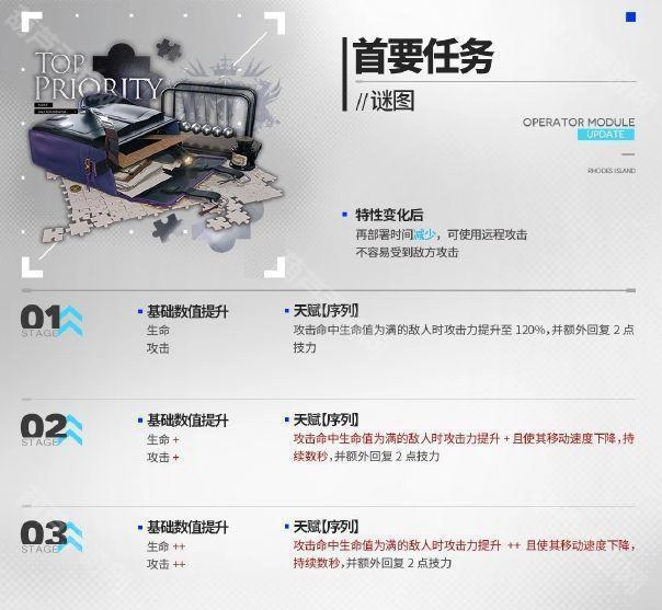 部署时,若周围4格没有其他干员,获得3(+1)点部署费用,攻击速度+15(持续10s)