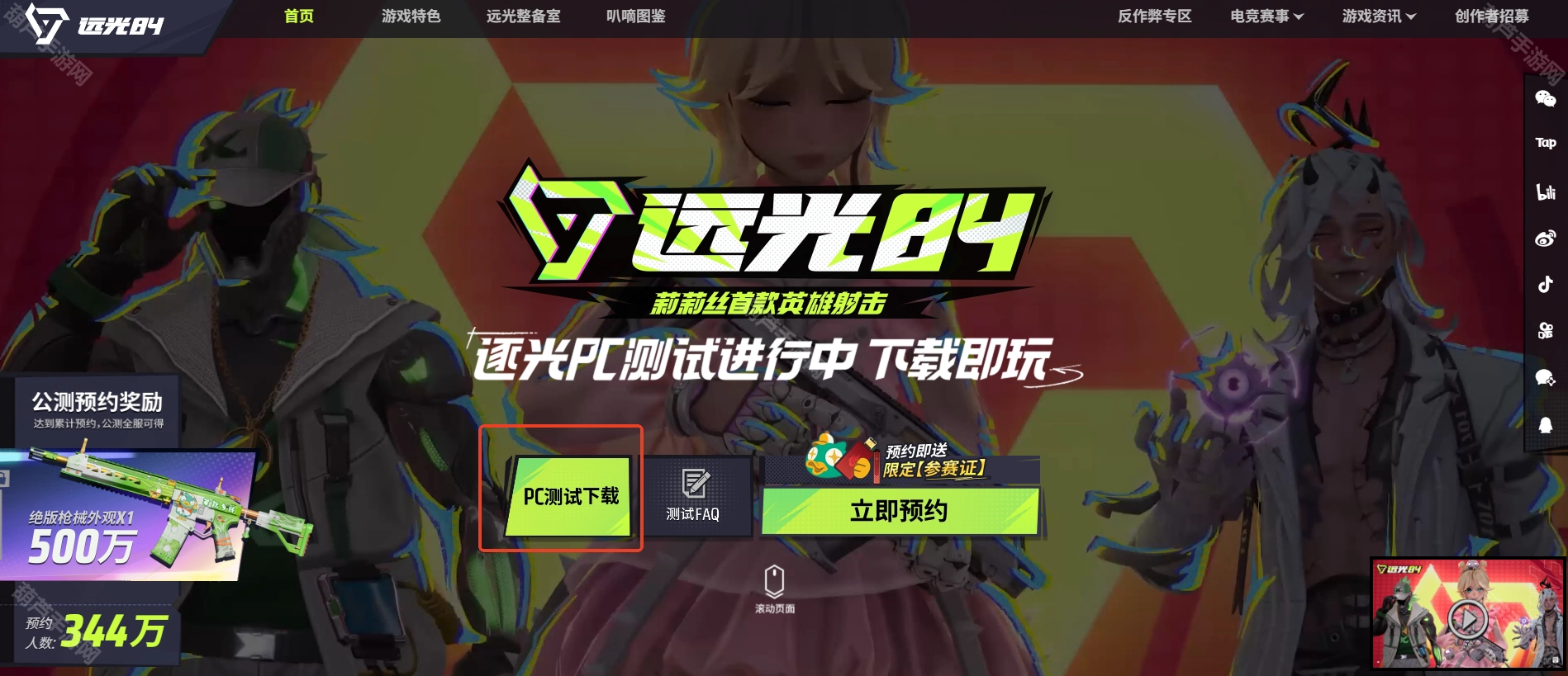 2、点击首页左下角的PC测试下载按钮,就能获取游戏安装包了。