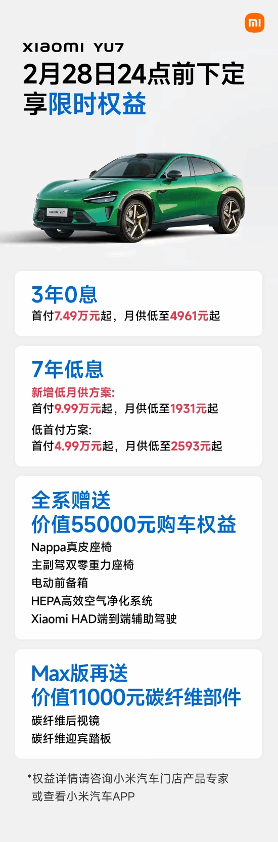 在1月15日晚间的直播里,小米创办人、董事长兼CEO雷军就已宣布小米YU7推出“7年低息”政策:首付4.99万元起,月供低至2593元起。而今日推出的新政策则给用户提供了更多选择,首付9.99万元起,月供最低还不到2000元。