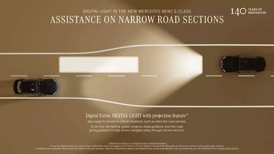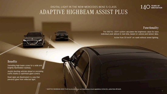 在高性能芯片驱动的微型LED照明模块助力下,奔驰指出,新款大灯的照明范围相比上一代增加了大约40%,亮度有明显增强,应对弯道时的配光效果也更为清晰精准。