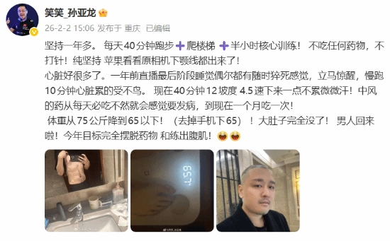 今日,知名主播、前职业选手孙亚龙通过微博向大家分享了自己的近况。此前曾确诊中风的他,如今已坚持锻炼一年有余,不仅大肚子消失了,服药量也减少了。他还为自己定下了新目标:今年要彻底摆脱药物依赖,并且练出腹肌!