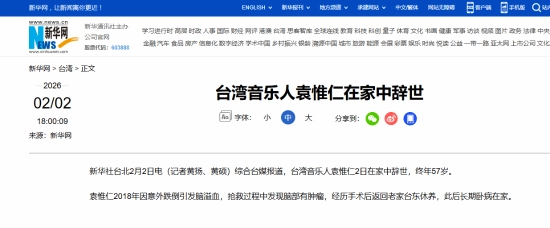 据新华网消息,综合中国台湾媒体报道及家属证实,知名词曲作家、音乐制作人袁惟仁于2026年2月2日在台东家中安详离世,享年57岁,他与病痛抗争了八年之久。家属经由好友陈子鸿向外界公布了这一消息,并透露将按照袁惟仁的遗愿,将其骨灰送回台北,与父亲合葬。